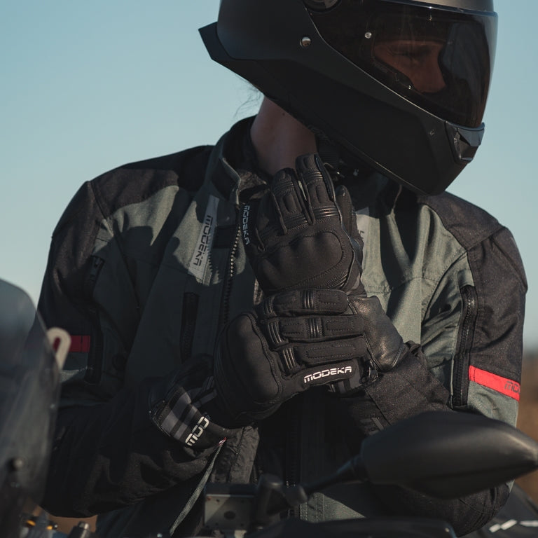 Modeka Makari Ladies Winter Gloves A comfortable Ladies winter glove with touch tip on thumb and index finger for easy operation of smartphone and navigation system. Functions: Tear-proof aniline cowhide Porelle Membrane: 100% waterproof, windproof and breathable Touch tip on thumb and index finger: easy operation of smartphone and navigation system Windproof softshell material (100% Polyester) Knuckle shell Thin, cold-insulating primaloft lining Windscreen wiper EN 13594:2015