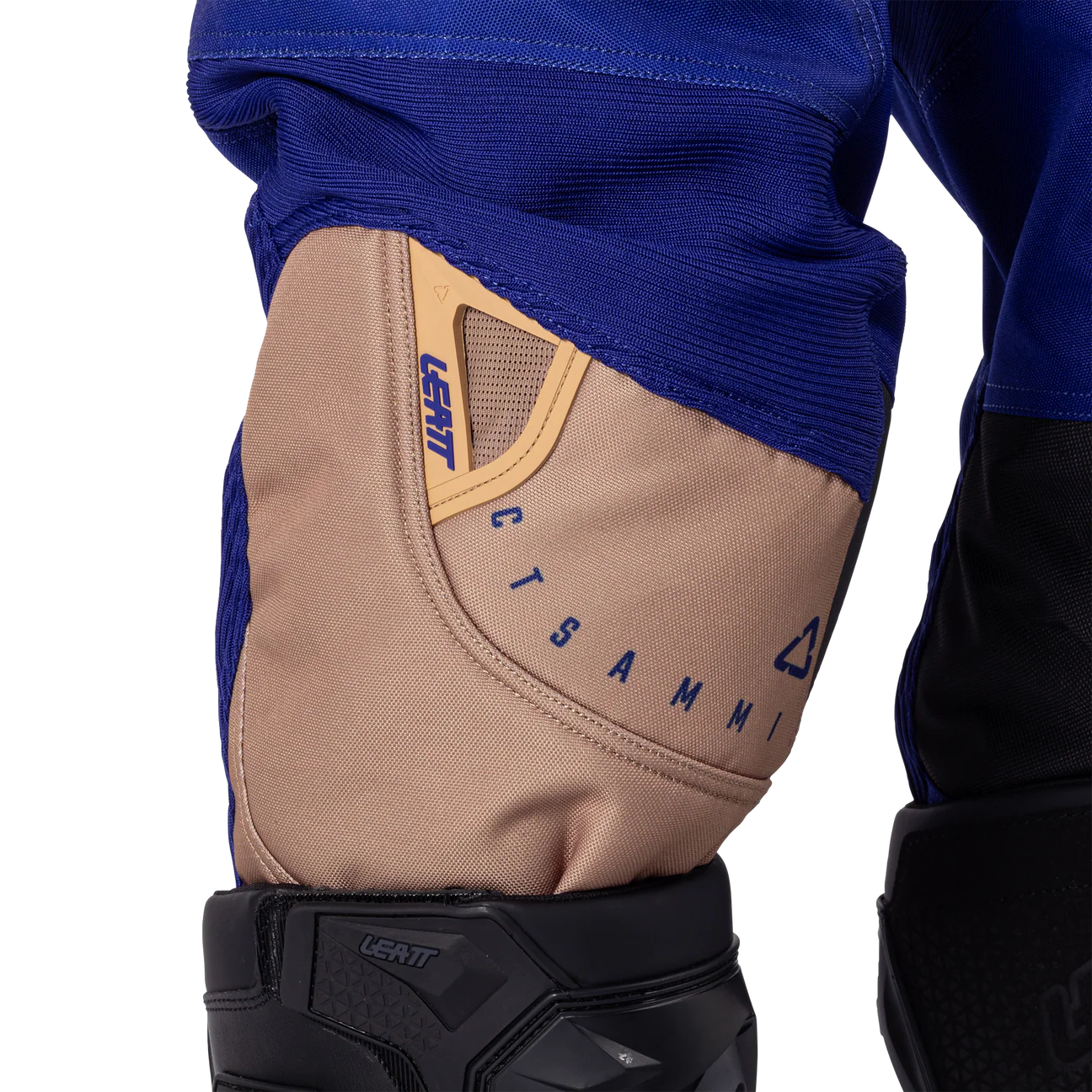 Refuerzo interno multicapa en la rodilla con cuero resistente al calor en el lado derecho.